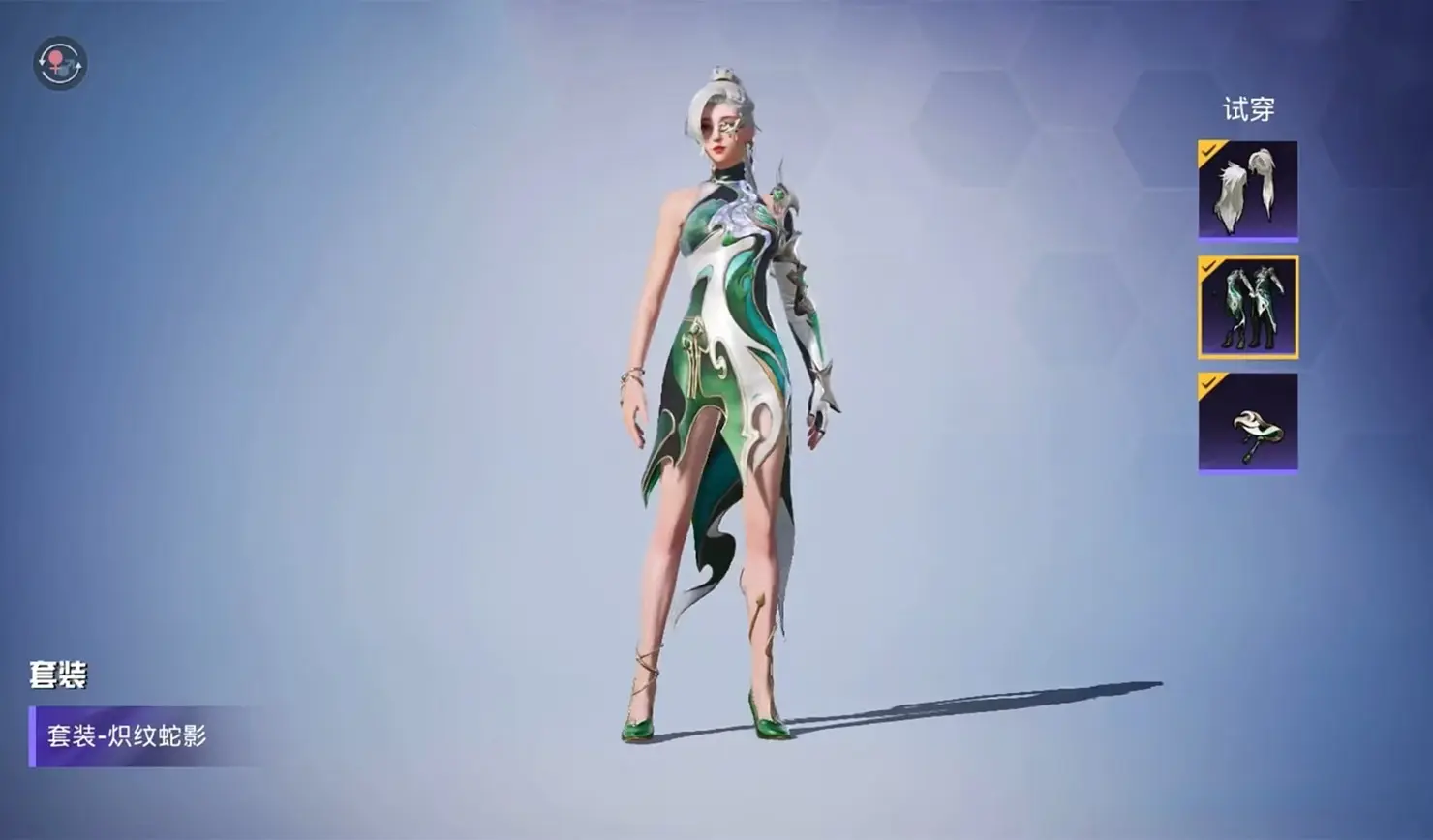 这套名为“炽纹蛇影”的新衣服,算是融入了蛇元素的国风主题类型,女角色的版型设定就是常见的“旗袍”,以个人的游戏审美来看,还算是马马虎虎吧~没办法,毕竟这款游戏里的同类皮肤早就多到数不清了。